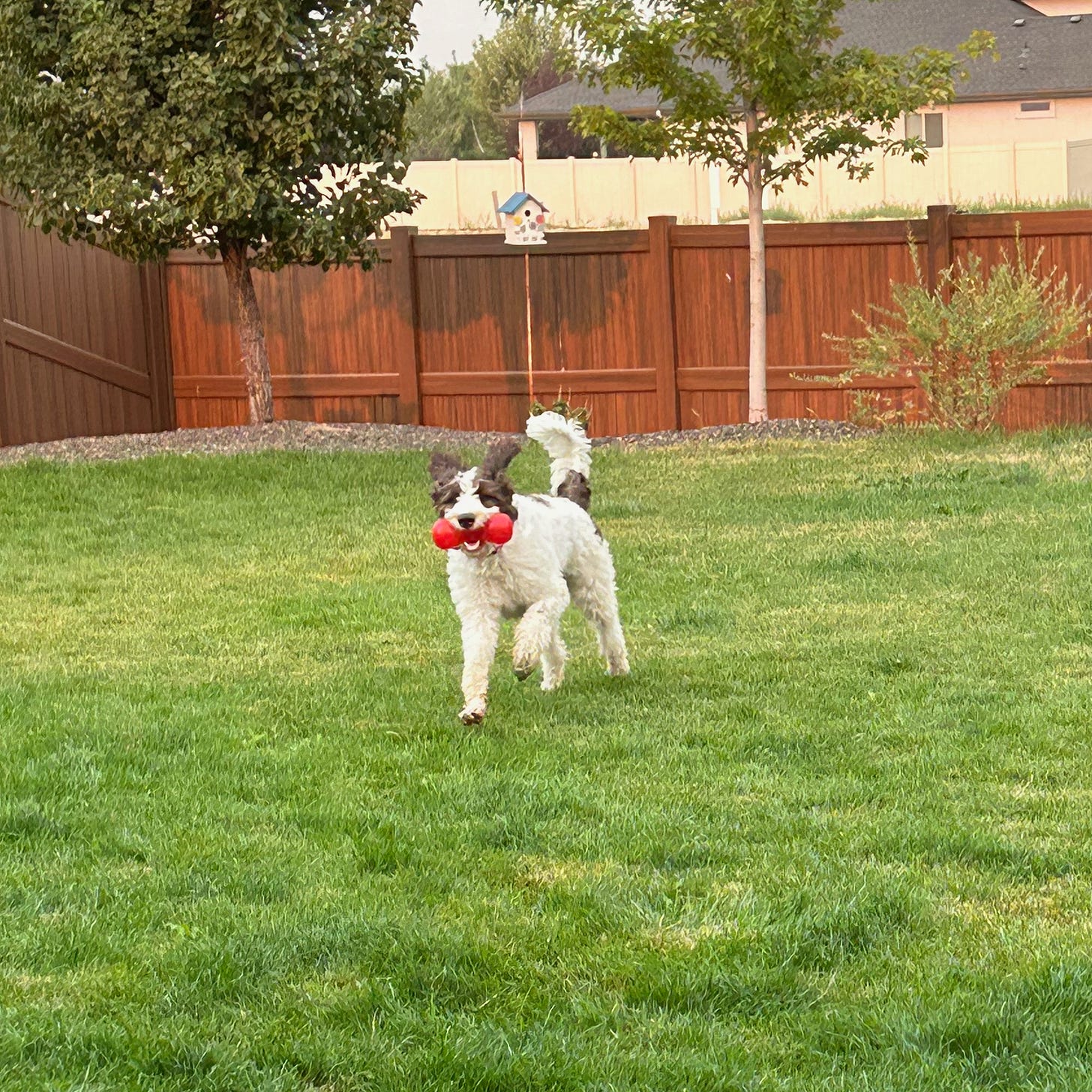 Erma gathered the last of the torn cards, threw them in the trash, and said, “I’ll bet you’re bored.” Dah, you think? She went in the pantry and came out with a new chew toy – a red Kong. She showed me how it squeaked, and I had a blast with that noisy plaything!